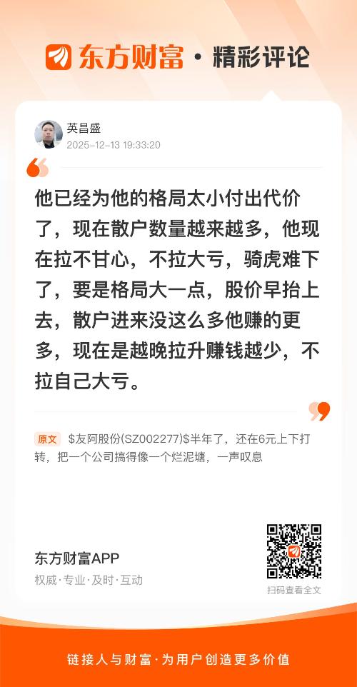 //@英昌盛 : 他已经为他的格局太小付出代价了,现在散户数量越来越多,他现在拉不甘心,不拉大亏,骑虎难下了,要是格局大一点,股价早抬上去,散户进来没这么多他赚的更多,现在是越晚拉升赚钱越少,不拉自己大亏。