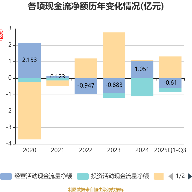 2025年前三季度,公司经营活动现金流净额为-6095.48万元,同比减少1450.06万元;筹资活动现金流净额1.32亿元,同比增加3611.9万元;投资活动现金流净额-2287.41万元,上年同期为-2940.11万元。