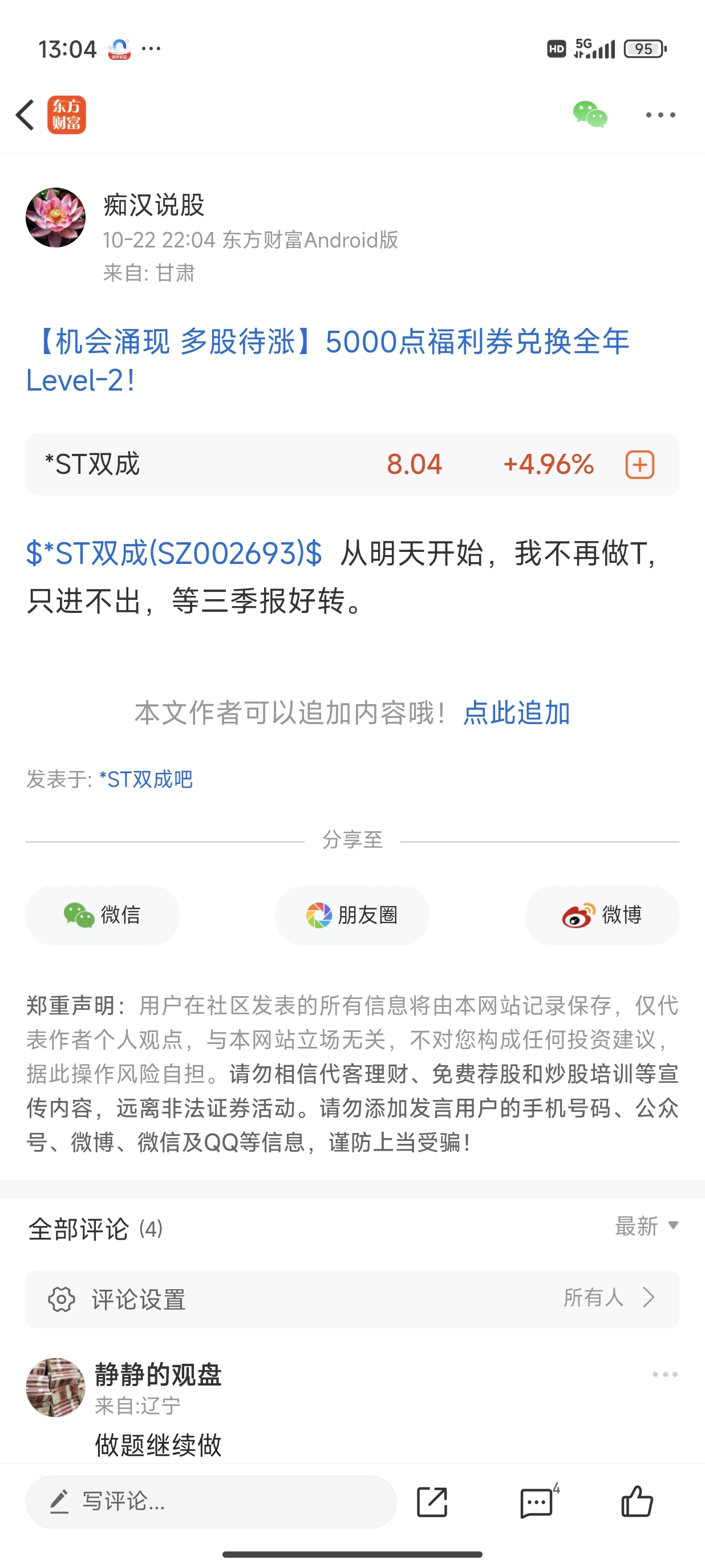 温馨提示: 1.根据《证券法》规定,禁止编造、传播虚假信息或者误导性信息,扰乱证券市场;2.用户在本社区发表的所有资料、言论等仅代表个人观点,与本网站立场无关,不对您构成任何投资建议。用户应基于自己的独立判断,自行决定证券投资并承担相应风险。《东方财富社区管理规定》