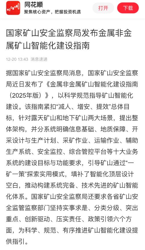 国家矿山安全监察局发布金属非金属矿山智能化建设指南$尤洛卡(SZ300099)$ 12-2013:43 据国家矿山安全监察局消息,国家矿山安全监察局近日发布了 《金属非金属矿山智能化建设指南(2025年版)》,以科学规范指导矿山智能化建设。该指南紧扣^减人、增安、提效"总体目标,针对露天矿山和地下矿山两大场景,提出整体架构,并分系统明确信息基础、地质保障、开采设计与生产计划、采矿作业、运输作业、辅助生产系统、安全监控、综合管控平台等十大业务系统的建设目标与功能要求,引导矿山通过"矿一策"探索实用模式,填补了智能化顶层设计空白,推动构建系统完备、技术先进的矿山智能化体系。国家矿山安全监察局还要求各省矿山安全监管监察部门坚持实事求是、分类分级、突出重点、创新驱动、压实责任、政策引领六个方面,为科学、规范、有序推进矿山智能化建设提供指引。$上证指数(SH000001)$