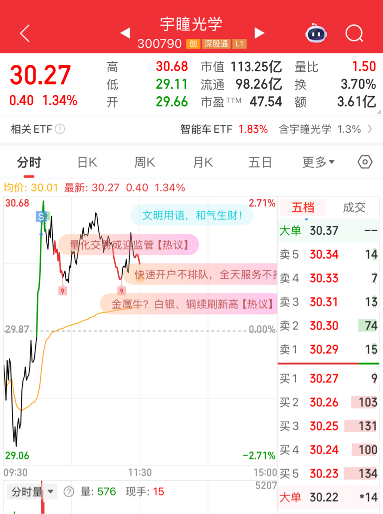 $宇瞳光学(SZ300790)$ 做t小能手,我来了,我又卖掉了,感谢主力。小散已走,可以开始拉了……#炒股日记# #复盘记录#