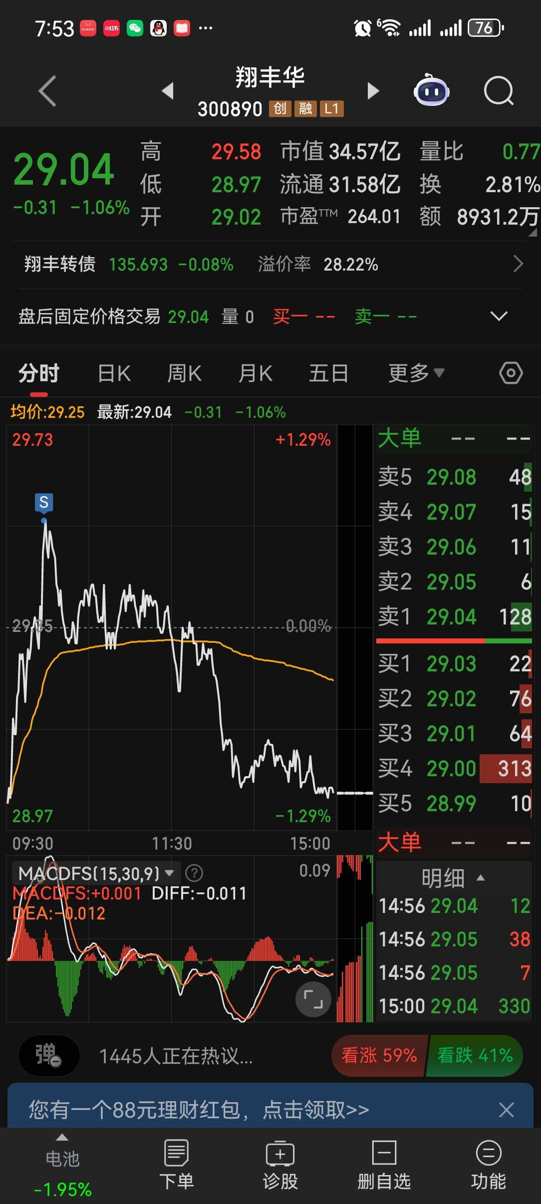 $翔丰华(SZ300890)$ 砸的太精准了,这个票估计只有我一个人赚钱了