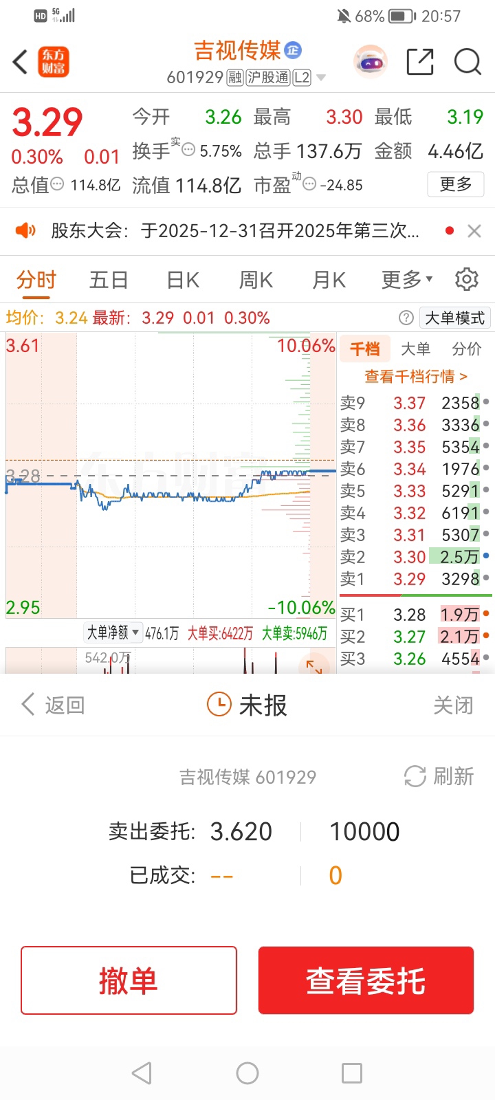 $吉视传媒(SH601929)$ 明天涨停价3.62,不涨停不卖!