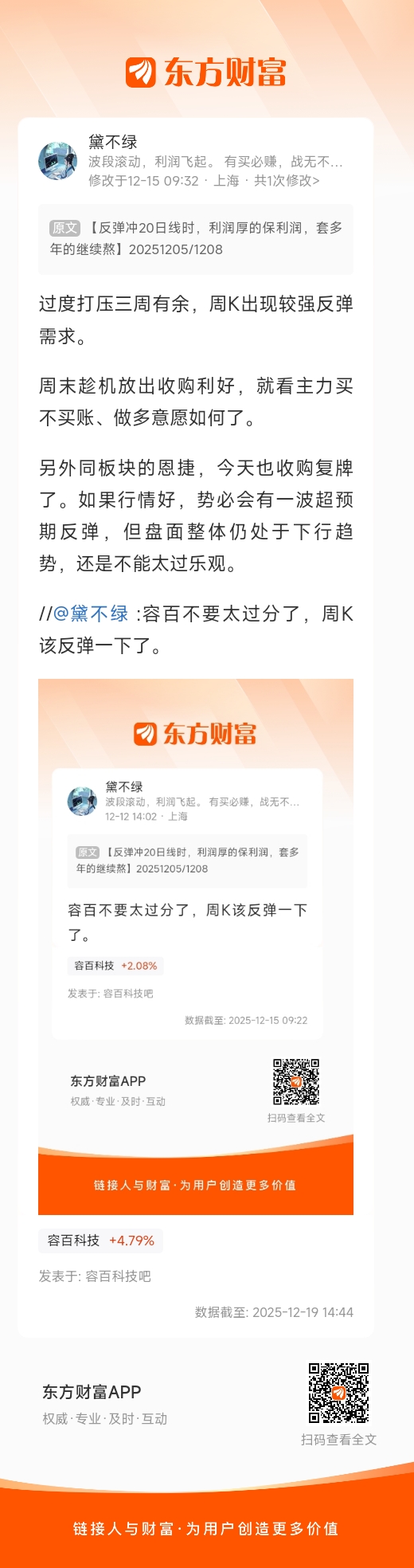 //@黛不绿 :过度打压三周有余,周K出现较强反弹需求。周末趁机放出收购利好,就看主力买不买账、做多意愿如何了。//@黛不绿 :容百不要太过分了,周K该反弹一下了。