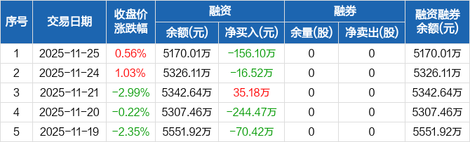 中科微至:融资净偿还156.1万元,融资余额5170.01万元(11-25)