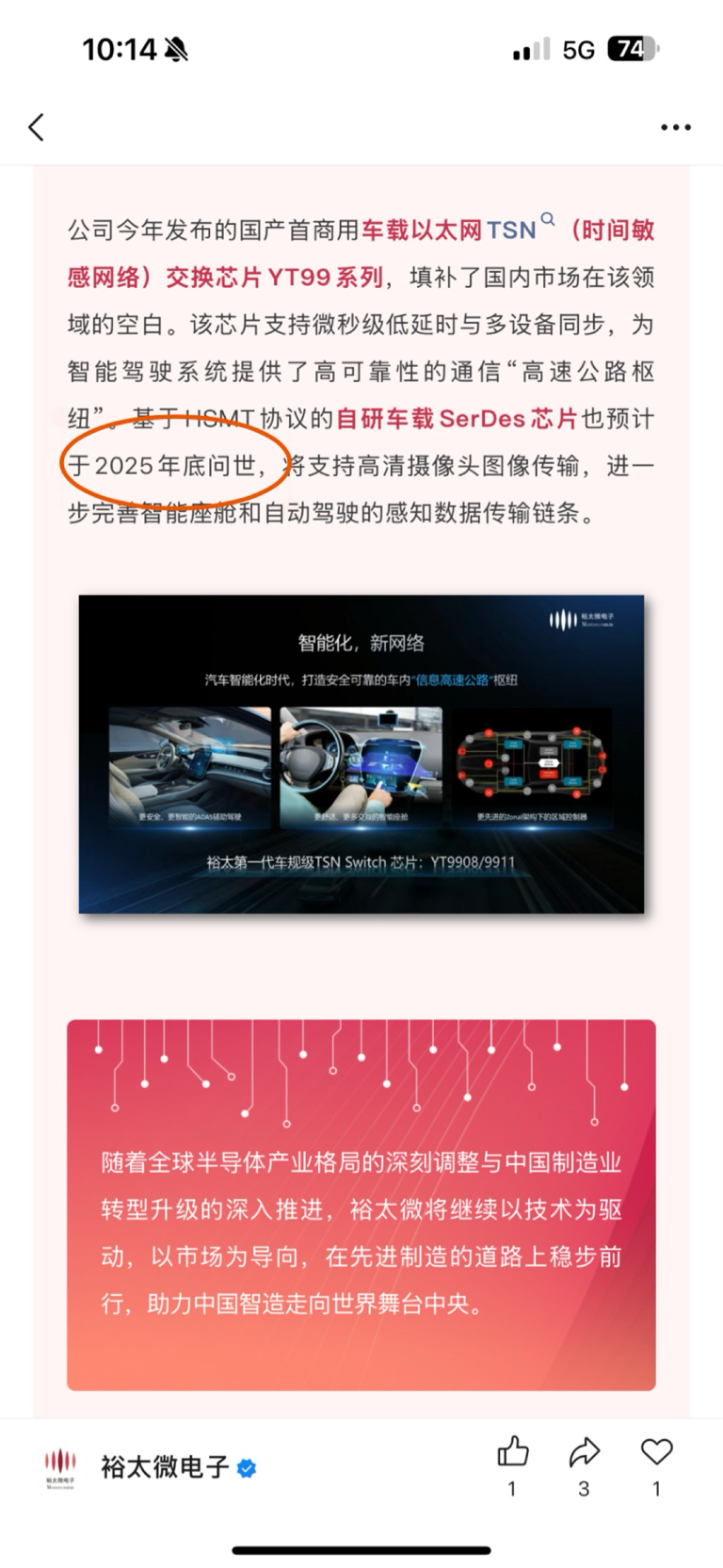 $裕太微-U(SH688515)$ 官微发的serdes芯片年底问世