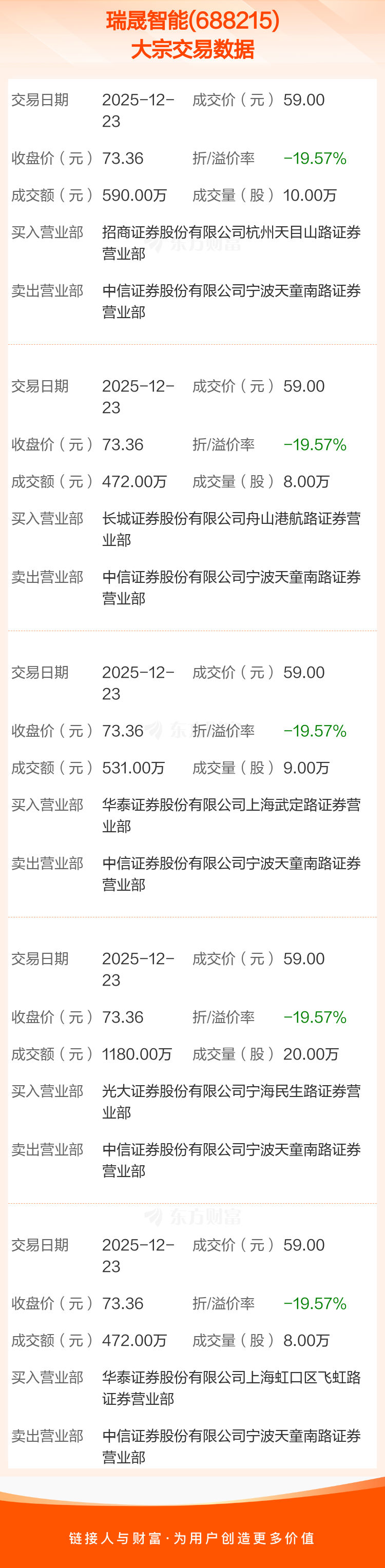 2025年12月23日,瑞晟智能发生5笔大宗交易,共成交55.00万股,成交金额3245.00万元,占其流通市值比例为0.71%。