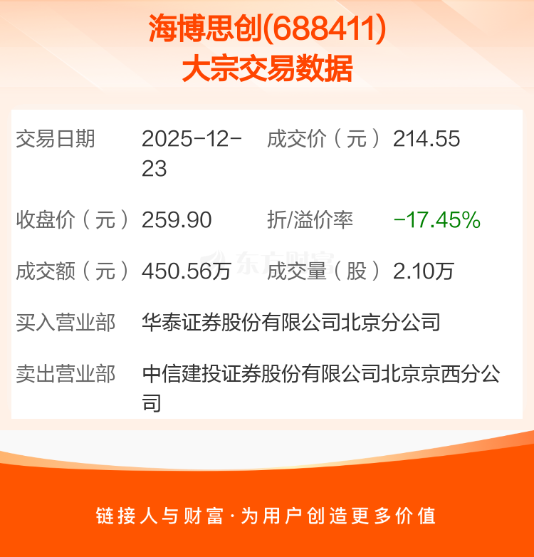 2025年12月23日,海博思创发生1笔大宗交易,共成交2.10万股,成交金额450.56万元,占其流通市值比例为0.05%。