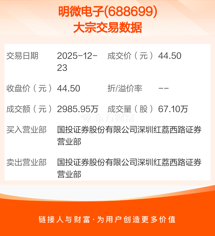 2025年12月23日,明微电子发生1笔大宗交易,共成交67.10万股,成交金额2985.95万元,占其流通市值比例为0.61%。