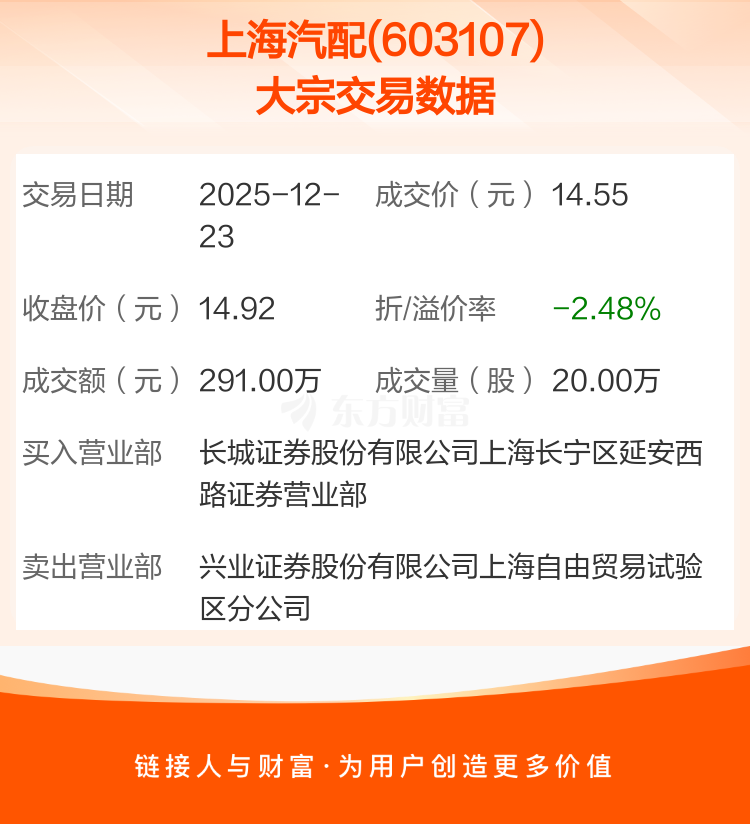 2025年12月23日,上海汽配发生1笔大宗交易,共成交20.00万股,成交金额291.00万元,占其流通市值比例为0.09%。