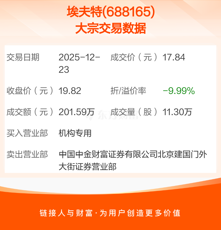 大宗交易:埃夫特成交201.59万元,折价9.99%(12-23)