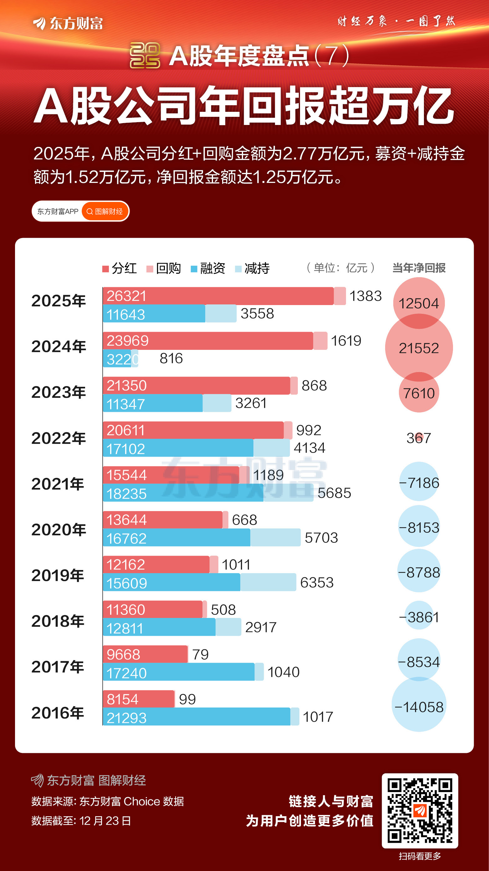 2025年A股净回报超1万亿元。据东方财富Choice数据,截至12月23日,2025年A股分红2.63万亿元,回购1383亿元,融资(IPO+再融资)1.16万亿元,减持3558亿元,该年A股“净回报”(分红+回购-募资-减持)达1.25万亿元。