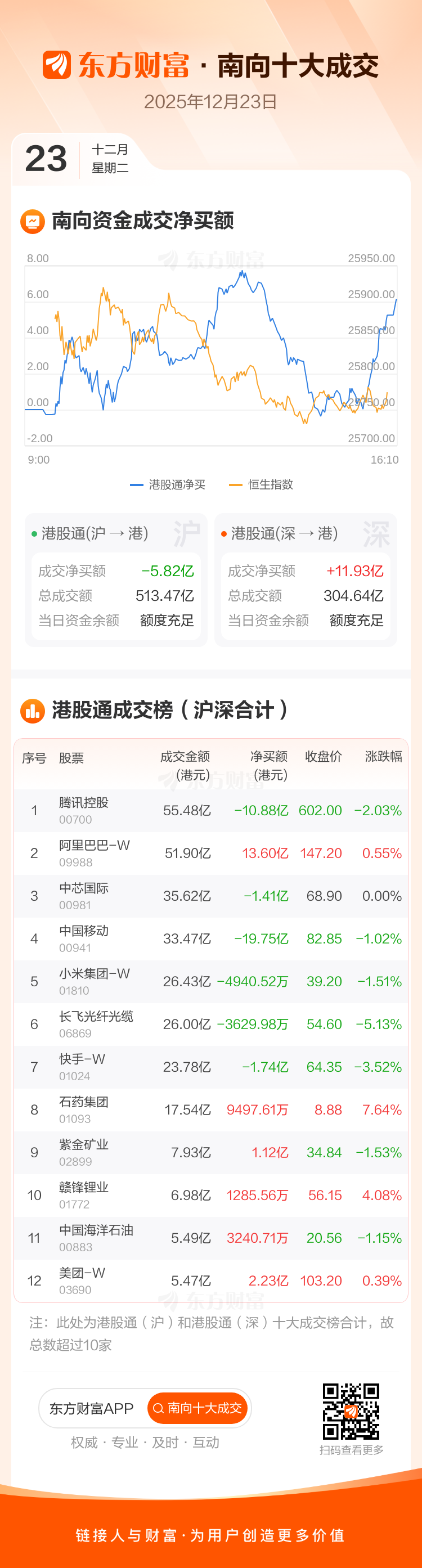 12月23日南向资金净买逾6亿港元,逾13亿抢筹阿里巴巴-W
