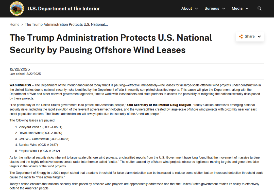 内政部长道格·伯古姆在声明中表示,此次行动旨在应对新出现的国家安全挑战,尤其是海上风电项目可能对关键基础设施和防务体系造成的影响。