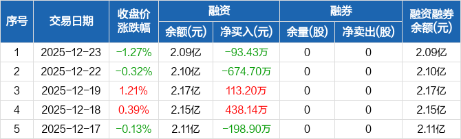 融资方面,当日融资买入994.27万元,融资偿还1087.7万元,融资净偿还93.43万元。融券方面,融券卖出0股,融券偿还0股,融券余量0股,融券余额0元。融资融券余额合计2.09亿元。