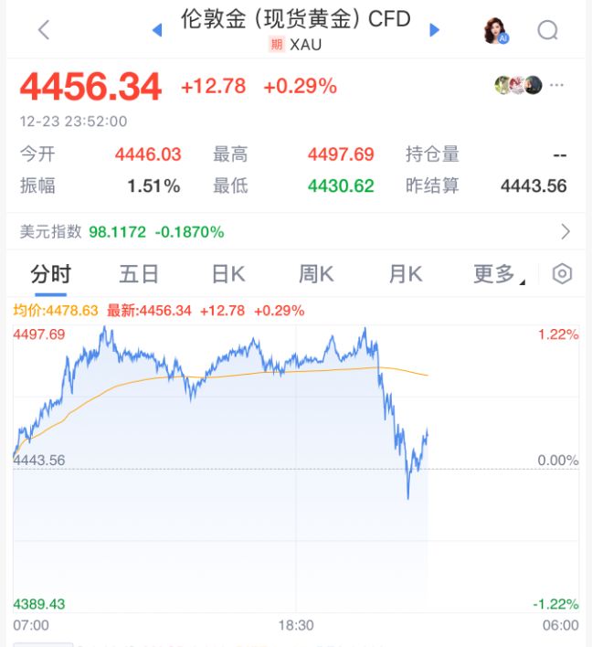 据每日经济新闻报道,12月24日,现货黄金首次升破4500美元/盎司,日内涨0.48%。今年累涨超1870美元。
