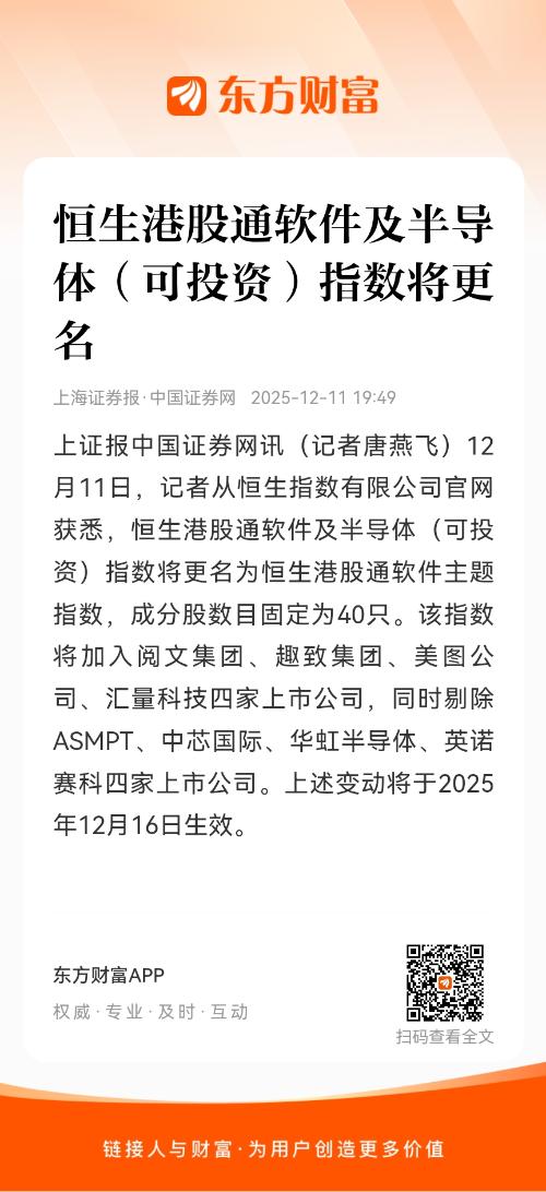上证报中国证券网讯(记者唐燕飞)12月11日,记者从恒生指数有限公司官网获悉,恒生港股通软件及半导体(可投资)指数将更名为恒生港股通软件主题指数,成分股数目固定为40只。该指数将加入阅文集团、趣致集团、美图公司、汇量科技四家上市公司,同时剔除ASMPT、中芯国际、华虹半导体、英诺赛科四家上市公司。上述变动将于2025年12月16日生效。