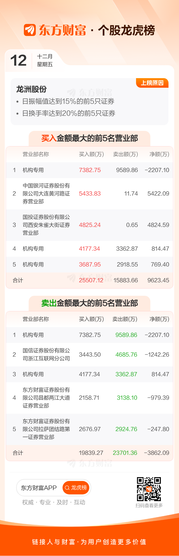 交易所2025年12月12日公布的交易公开信息显示,龙洲股份因成为日振幅值达到15%的前5只证券、日换手率达到20%的前5只证券上榜。龙洲股份当日收报10.85元,涨跌幅10.04%,偏离值17.17%,换手率51.23%,成交额30.19亿。