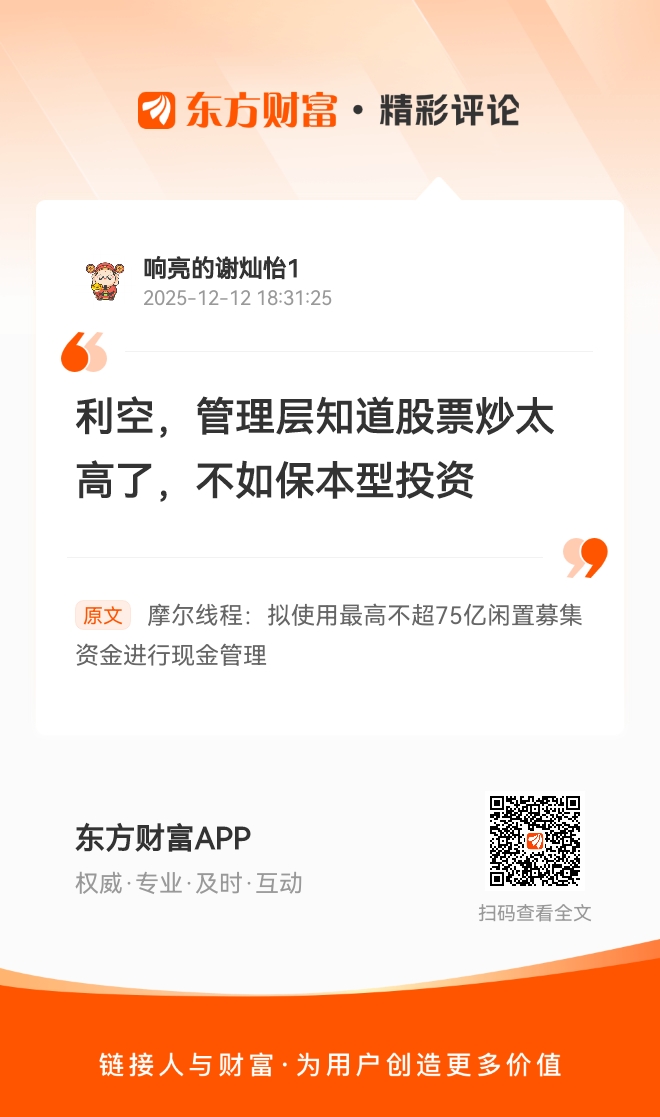 利空,管理层知道股票炒太高了,不如保本型投资 我在《摩尔线程:拟使用最高不超75亿闲置募集资金进行现金管理》的评论获得了大家的关注。