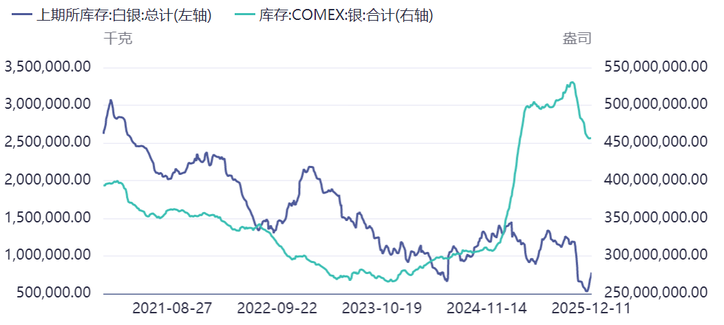 图片说明:上期所与COMEX白银库存,数据来源于同花顺
