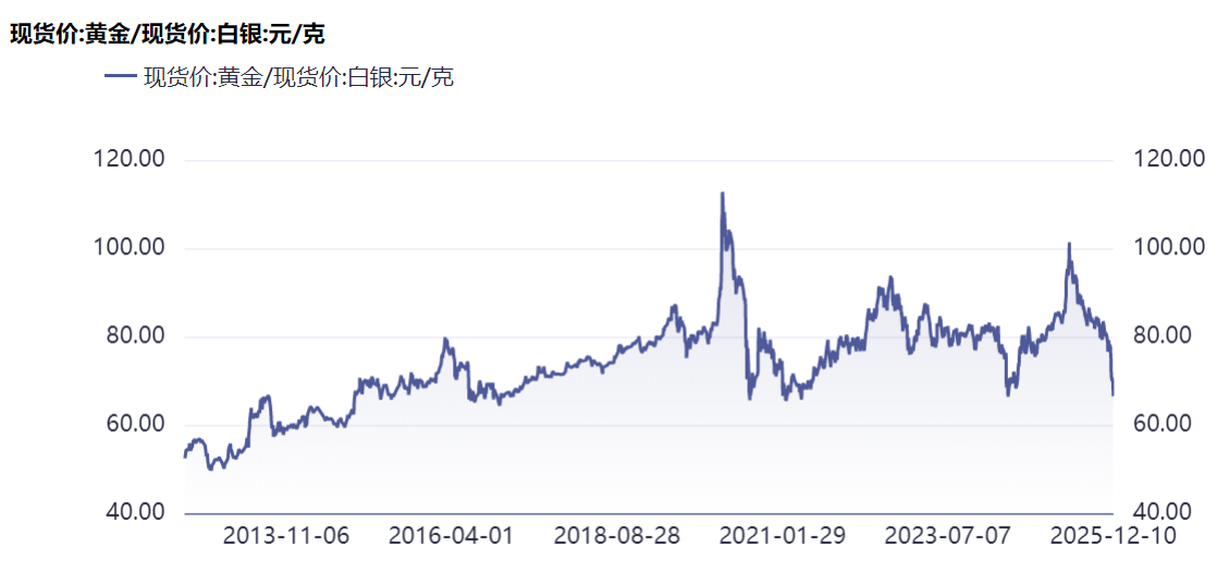 国际市场,随着COMEX银日内涨幅超过3%,价格创出历史新高。国内市场,今年以来沪银涨幅已接近翻倍,远超黄金50%以上的同期涨幅。即便沪金价格曾突破千元大关,但在白银的疯狂涨势面前也稍显逊色。当前金银比已降至67倍,处于近十年来低位,意味着白银价值正处于不容忽视的地位。
