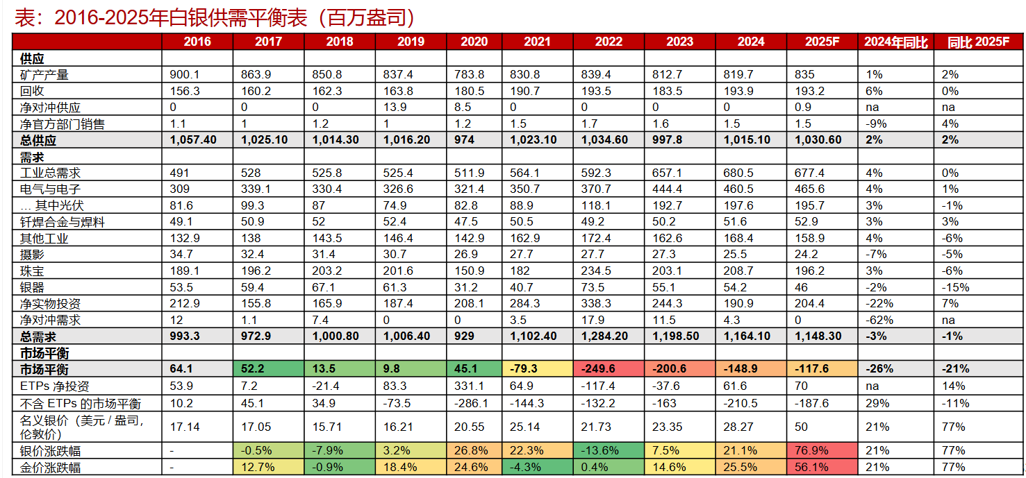 图片说明:2016-2025年白银供需平衡表,数据来源于世界白银协会,浙商证券研究所