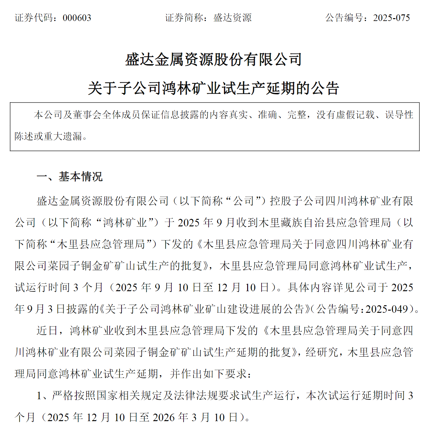 然而,近期的一则公告引起了市场关注。12月10日,盛达资源公告将鸿林矿业的试生产延期三个月至2026年3月10日。鸿林矿业试运行延期期间将同步按规定办理安全生产许可证,取得安全生产许可证后方可正式投产。