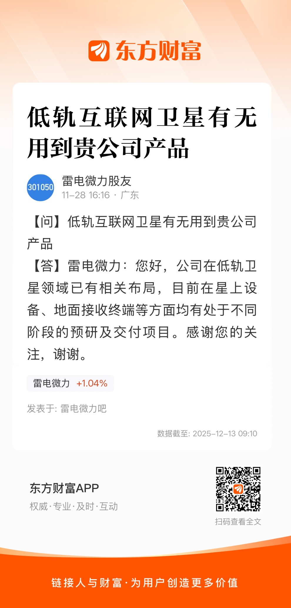 您好,公司在低轨卫星领域已有相关布局,目前在星上设备、地面接收终端等方面均有处于不同阶段的预研及交付项目。感谢您的关注,谢谢。
