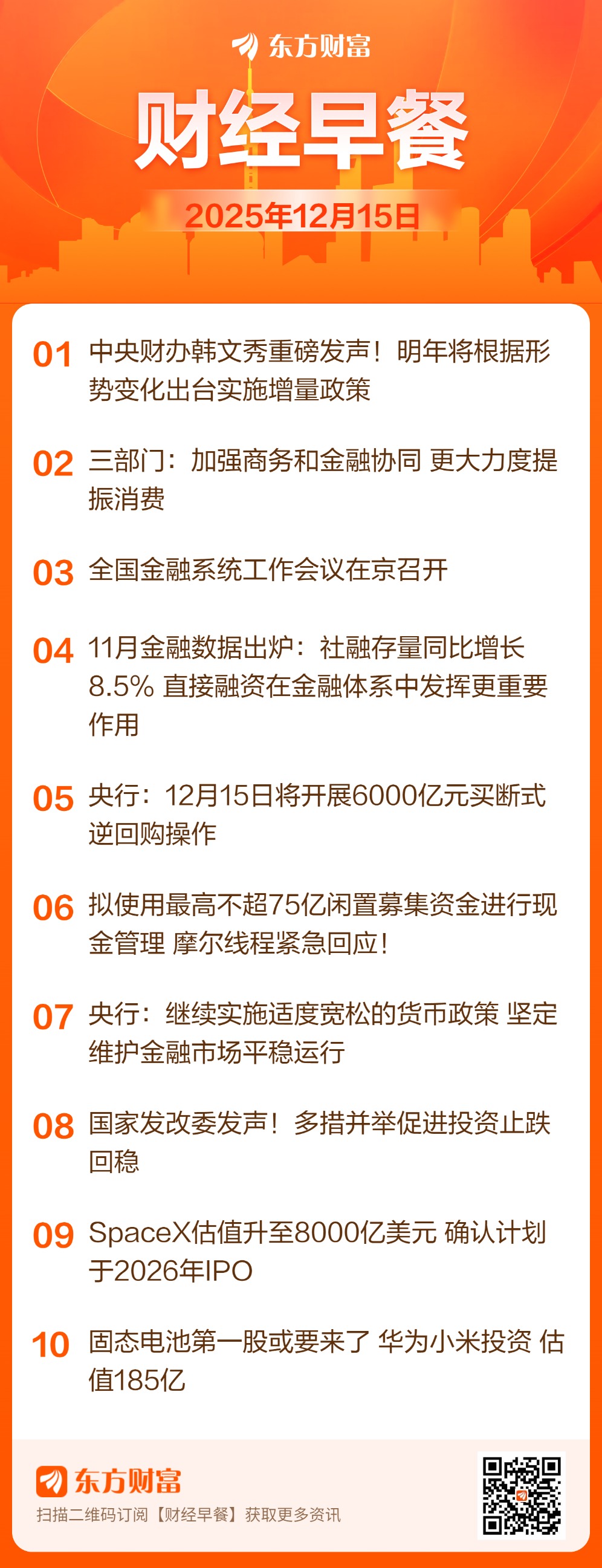 全国金融系统工作会议12月12日在京召开。中共中央政治局委员、中央金融委员会办公室主任何立峰出席会议并讲话。他强调,金融系统要深入学习贯彻中央经济工作会议精神,准确把握经济工作面临的形势和主要目标任务,坚定做好金融工作的信心和决心,坚持防风险、强监管、促高质量发展工作主线,有力有序有效做好2026年金融重点工作。继续实施好适度宽松的货币政策,加强对扩大内需、科技创新、中小微企业等重点领域的金融支持,稳步有序推进金融改革开放,做好预期管理。