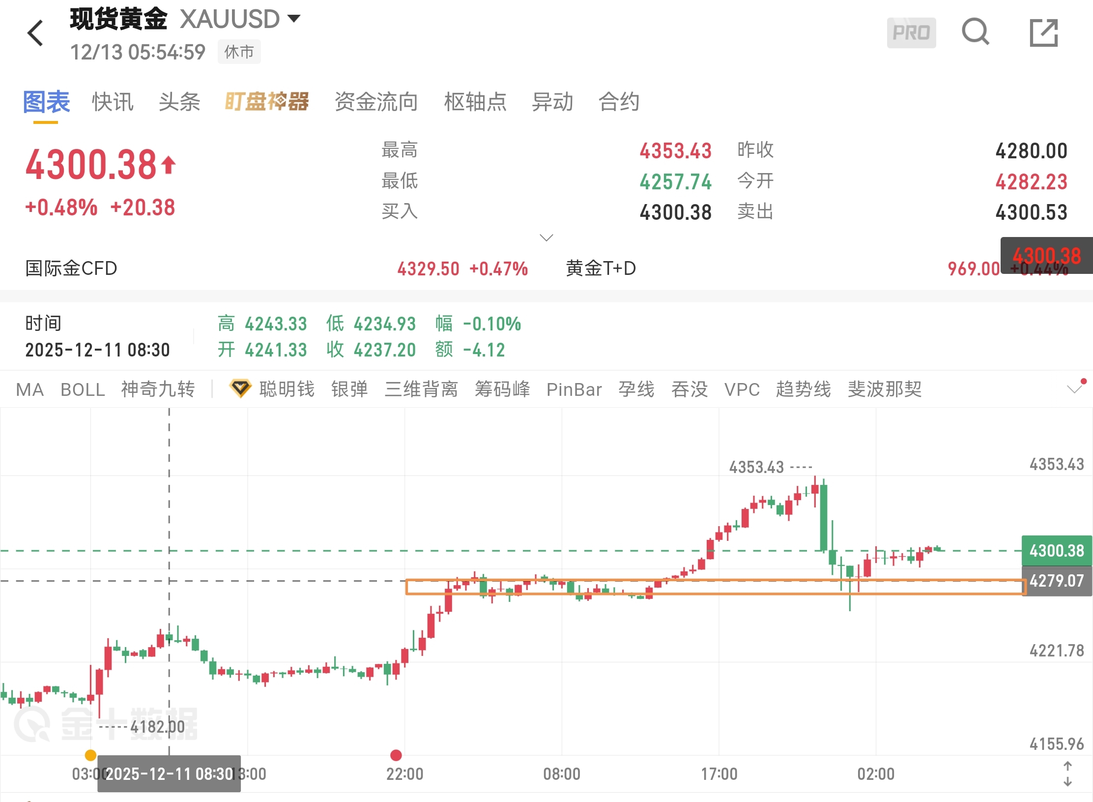 黄金上周尾冲高回落,尾盘收在4300高位。周一开盘情况就很关键。如果高开高走那还