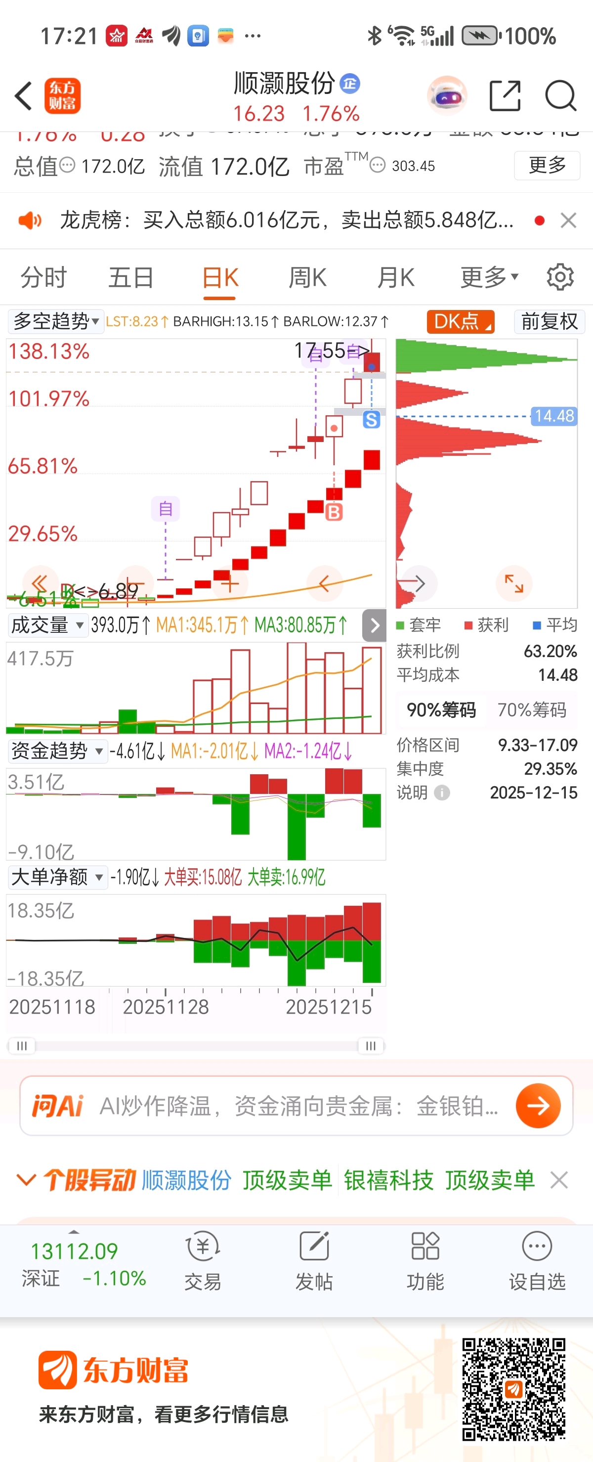 放量滞涨,顶格等码松动,今日主力出货,明天洗盘