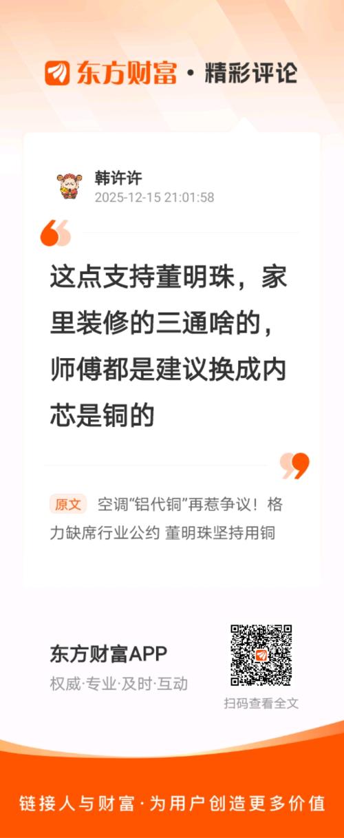 12月14日晚,董明珠接受采访时表示,“铝的技术我们研究了多年,但依然坚持不用‘铝代铜’的原因是,它还没有达到与铜同等的技术条件和保障。”