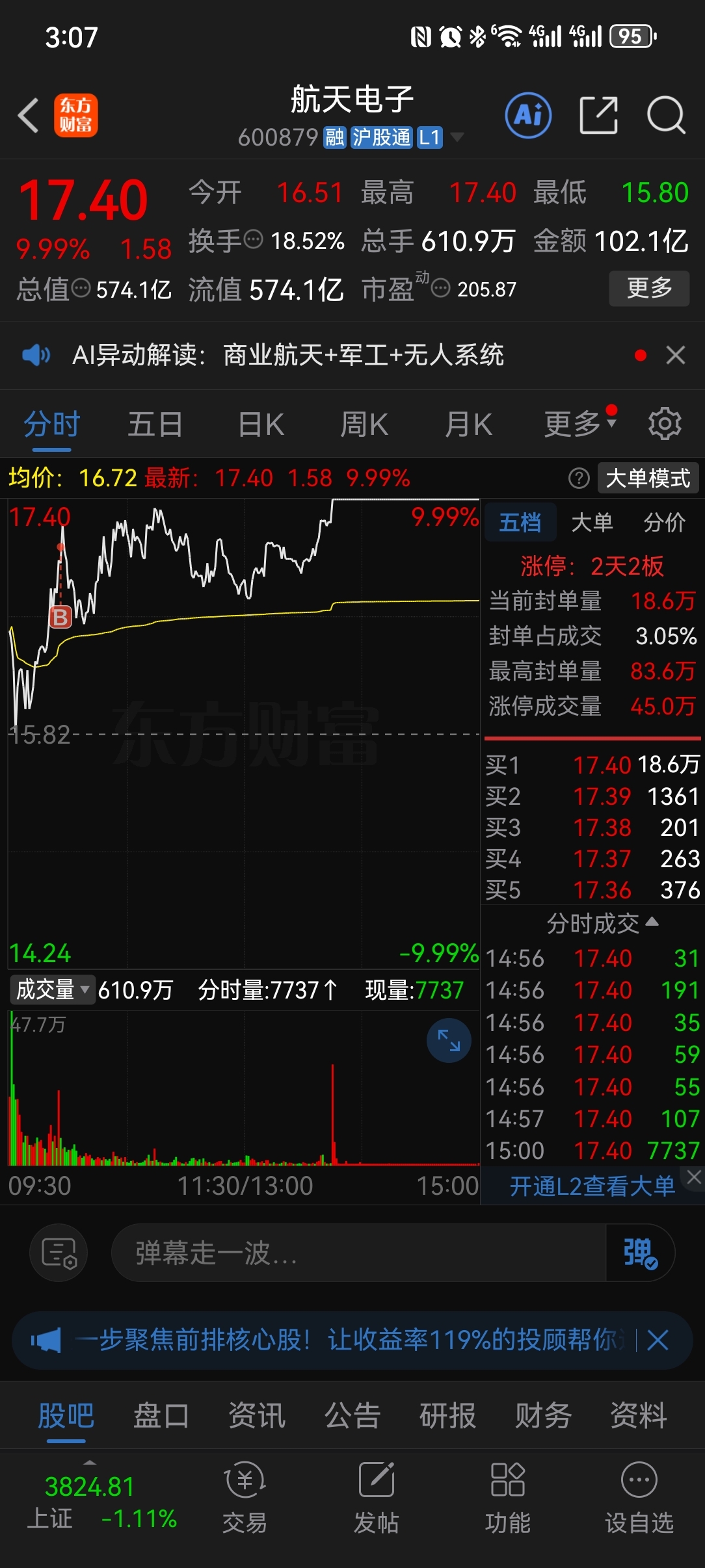 今天上车航天电子,航天信息,大家切勿跟风哦!我是做短线的哦!说不定你会给我接盘哦!想互相交流的话可以移步别的地方哦!私密后花园