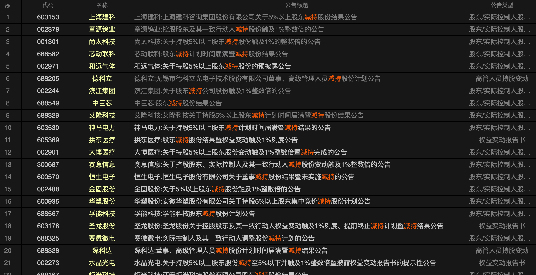最近一段时间A股大幅下跌,而这波下跌很多公司还在发布减持公告,今天晚上又是21股发布了减持公告,这些上市公司的高管,控股股东都在砸盘,千万要注意别踩雷了。