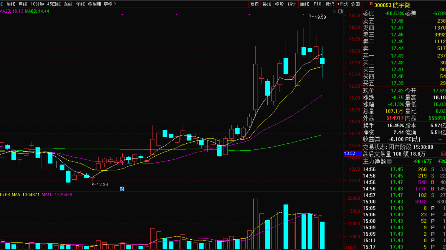 航宇微300053,商业航天概念, 昨天回踩10日线,早盘出了货,下午有低位又抄进了,有点差价,还是看好商业航天板块,这股走势还可以,经过昨天调整收星,今天可能有机。