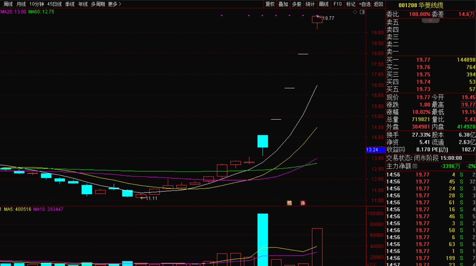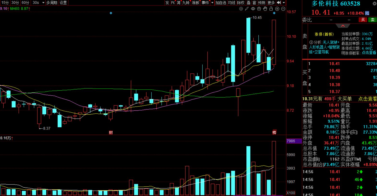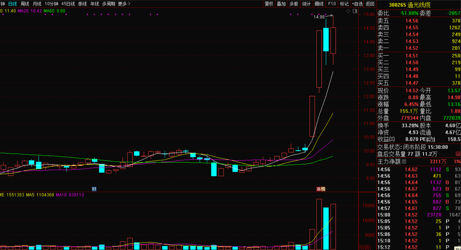 现在是商业航天第一龙头股,4连板的高度,昨天开板涨停,盘感依然极强,开盘1分钟即涨停,1分钟成交11.8亿,之后没有开板,强势不减,第一龙头的强势不用怀疑,今天很有机会出第5板,关注。
