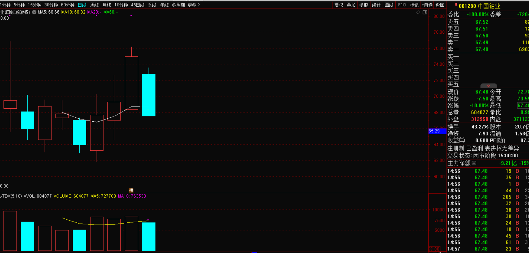 $中国铀业(SZ001280)$,核电板块,中国铀业主营业务是天然铀资源的采冶、销售及贸易,以及独居石、铀钼等放射性共伴生矿产资源综合利用及产品销售。这股是新股,不能按板块来分析,分享它主要是昨天大盘下跌,大涨的品种容易补跌,特别是高位的品种,如果明天反弹,有强势回踩的品种是最佳选择,中国铀业有些符合,昨天实体大阳线,出货迹象不明显。今天跌停,封单比较少,跌停板上有资金吸货迹象。明天有反包可能,早盘下跌后能快速翻红的话,可能关注。