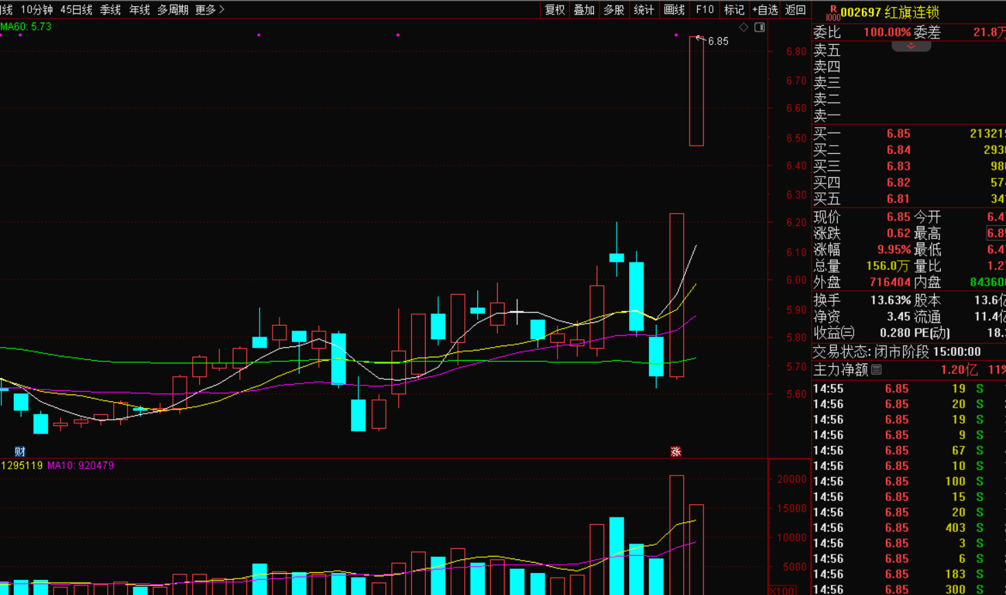 $红旗连锁(SZ002697)$,零售板块前天大涨,红旗连锁早盘涨停,这股位置相对比较低,盘感比较好,均线向上发散,昨天高开涨停,现哥竞价上车食肉,主要是政策行情,短线肯定是有机会的。昨天缩量了,今天高开竞价就出货。