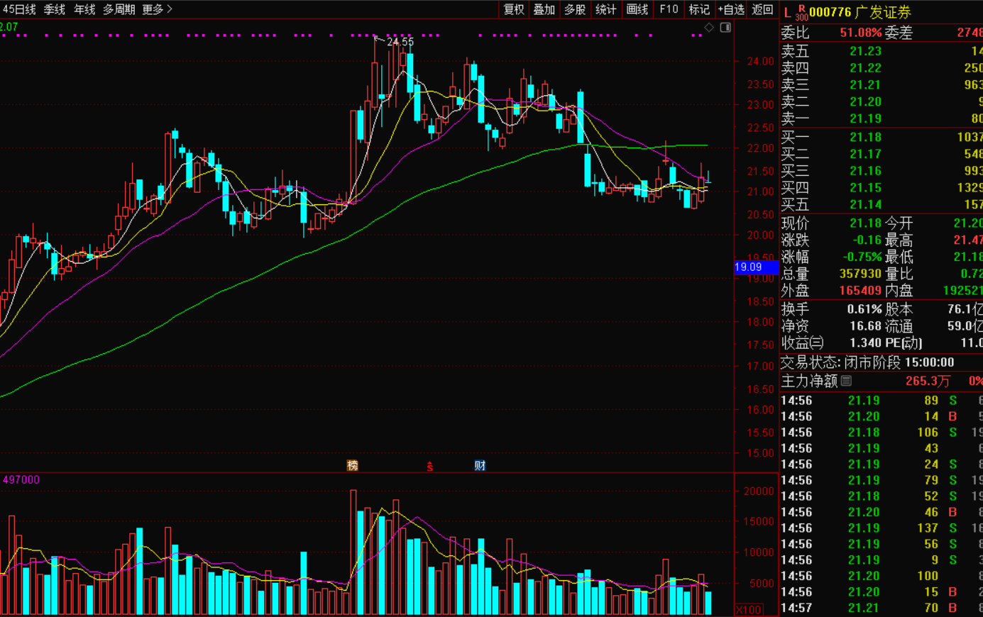 广发证券000776,第三季度增长61%。广发属于传统绩优的估值型,走势偏稳,现在券商中它的走势较好,调整后有机会走好,10月15日分享中长线上车,经过反复震荡走弱跌破60日线,这个走势要在60日线下方折腾一些时间了,现在在低位震幅极少,昨天微跌收星,继续磨底吧。