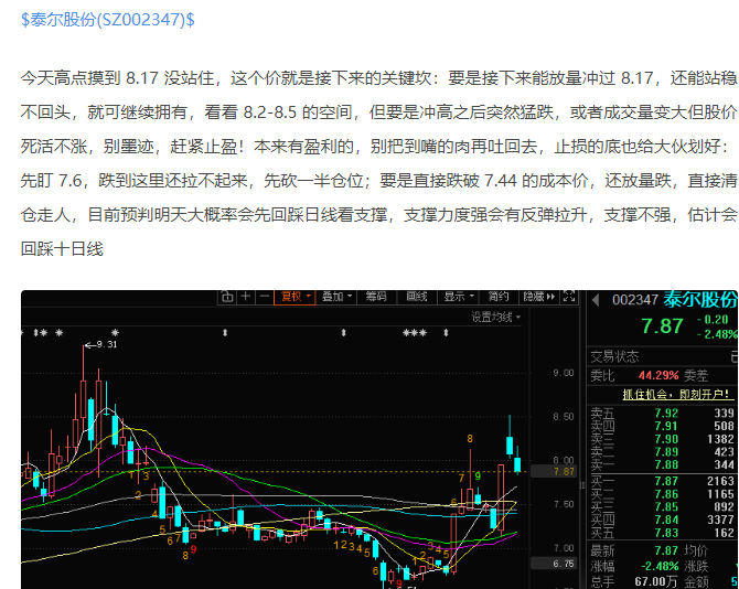 该股昨天下跌超预期,小君就没买入但是还是给各位持该股的朋友们解析下今天的操作后续.该股今天要是跌破5日线趋势开始走下的话小君不建议进场,同样道理有持该股的朋友们跌破5日线可先减少仓一部分,趋势一直在5日线上方的话就持续拥有就好了,要是明天趋势跟小君预判的5日线上方不破有合适的价位也会直接开仓此股,直接上干货。
