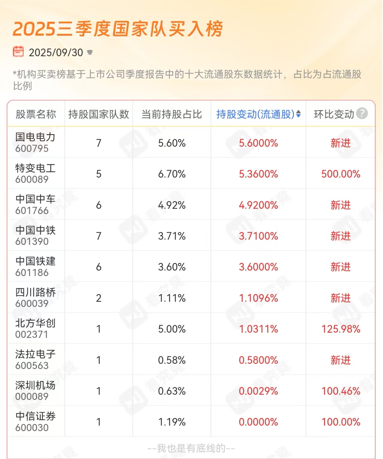 国家队3季度新进了 国电电力、中国中车、中国中铁、四川路桥、法拉电子