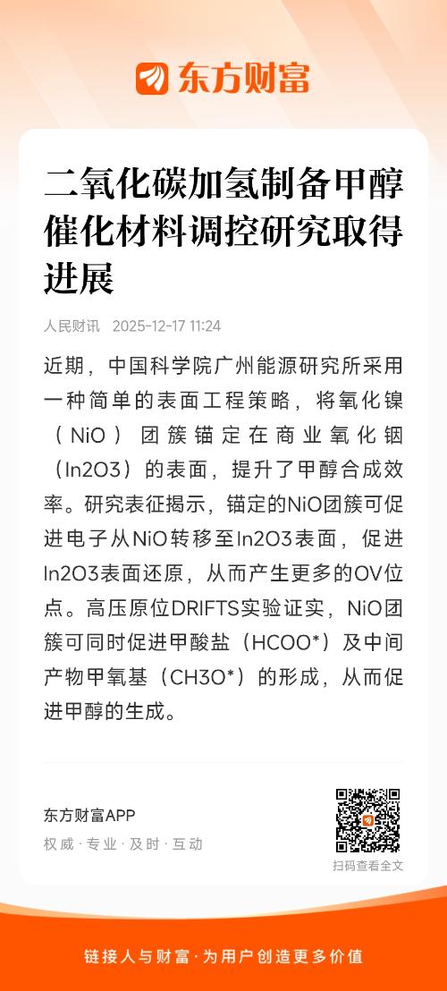 据中国科学院消息,近期,中国科学院广州能源研究所采用一种简单的表面工程策略,将氧化镍(NiO)团簇锚定在商业氧化铟(In2O3)的表面,提升了甲醇合成效率。研究表征揭示,锚定的NiO团簇可促进电子从NiO转移至In2O3表面,促进In2O3表面还原,从而产生更多的OV位点。高压原位DRIFTS实验证实,NiO团簇可同时促进甲酸盐(HCOO*)及中间产物甲氧基(CH3O*)的形成,从而促进甲醇的生成。