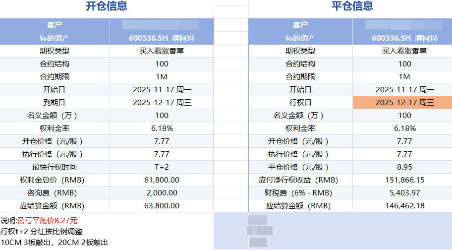 玛,看涨期权,期权合约1个月,期权费6.18W,持仓时间1个月,行权结算14.65W,净收益8.47W
