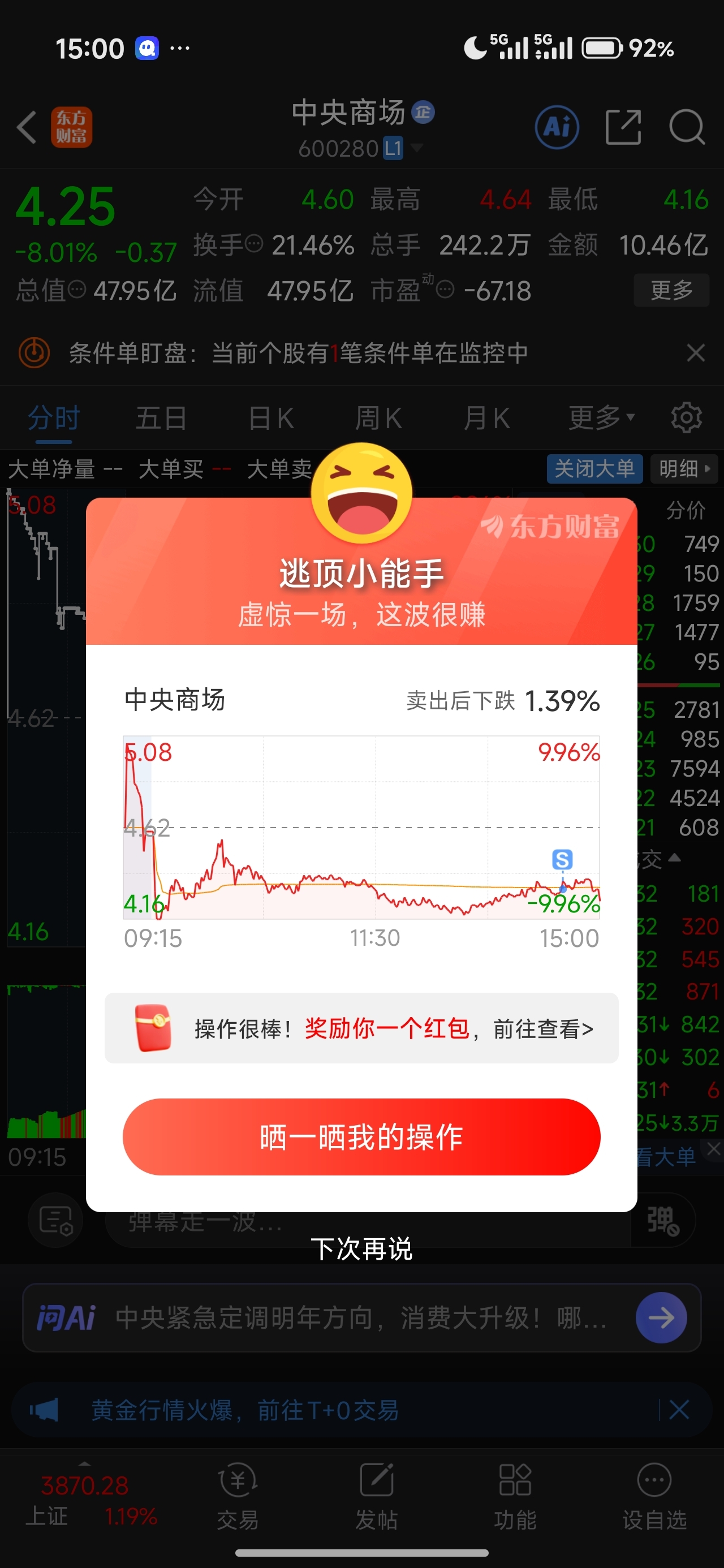 今天大盘虽然红了,但是持仓收绿,主要是中央商业没有操作好,集合竞价走弱就应该跑的,开盘瞬间就跌停了,就反红一下都没来的及卖,一直拿到尾盘赚个手续费出了,全天走势比较弱,垃圾股以后不会在买它。