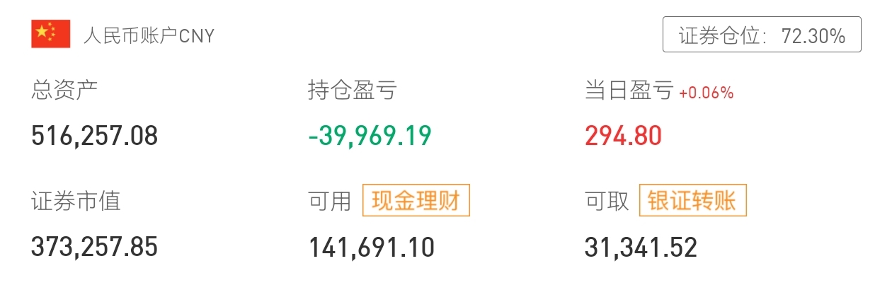 人民币账户持仓稳健,小幅浮盈,现金理财灵活,资产配置均衡。