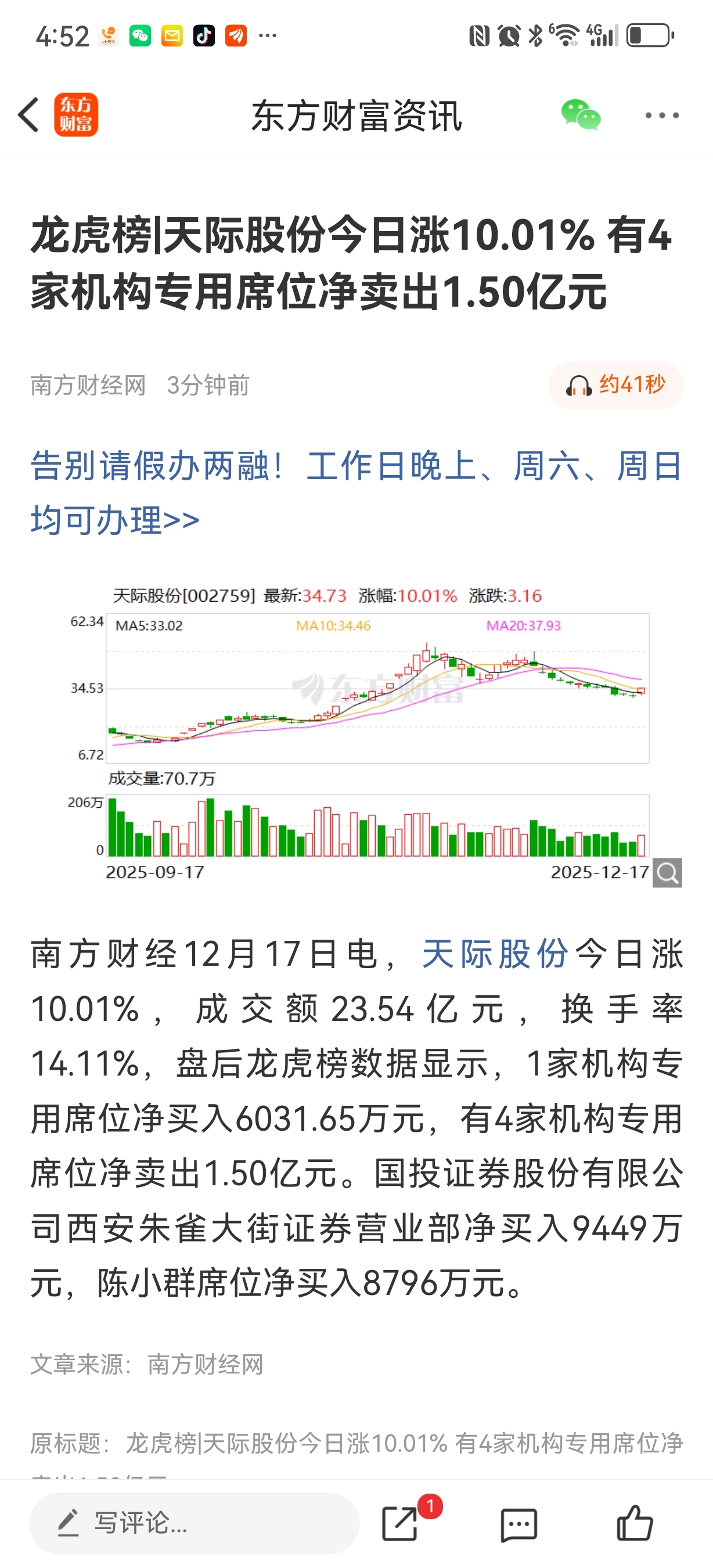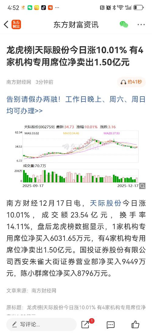交易所2025年12月17日公布的交易公开信息显示,天际股份因成为日涨幅偏离值达到7%的前5只证券上榜。天际股份当日收报34.73元,涨跌幅10.01%,偏离值8.32%,换手率14.11%,成交额23.54亿。