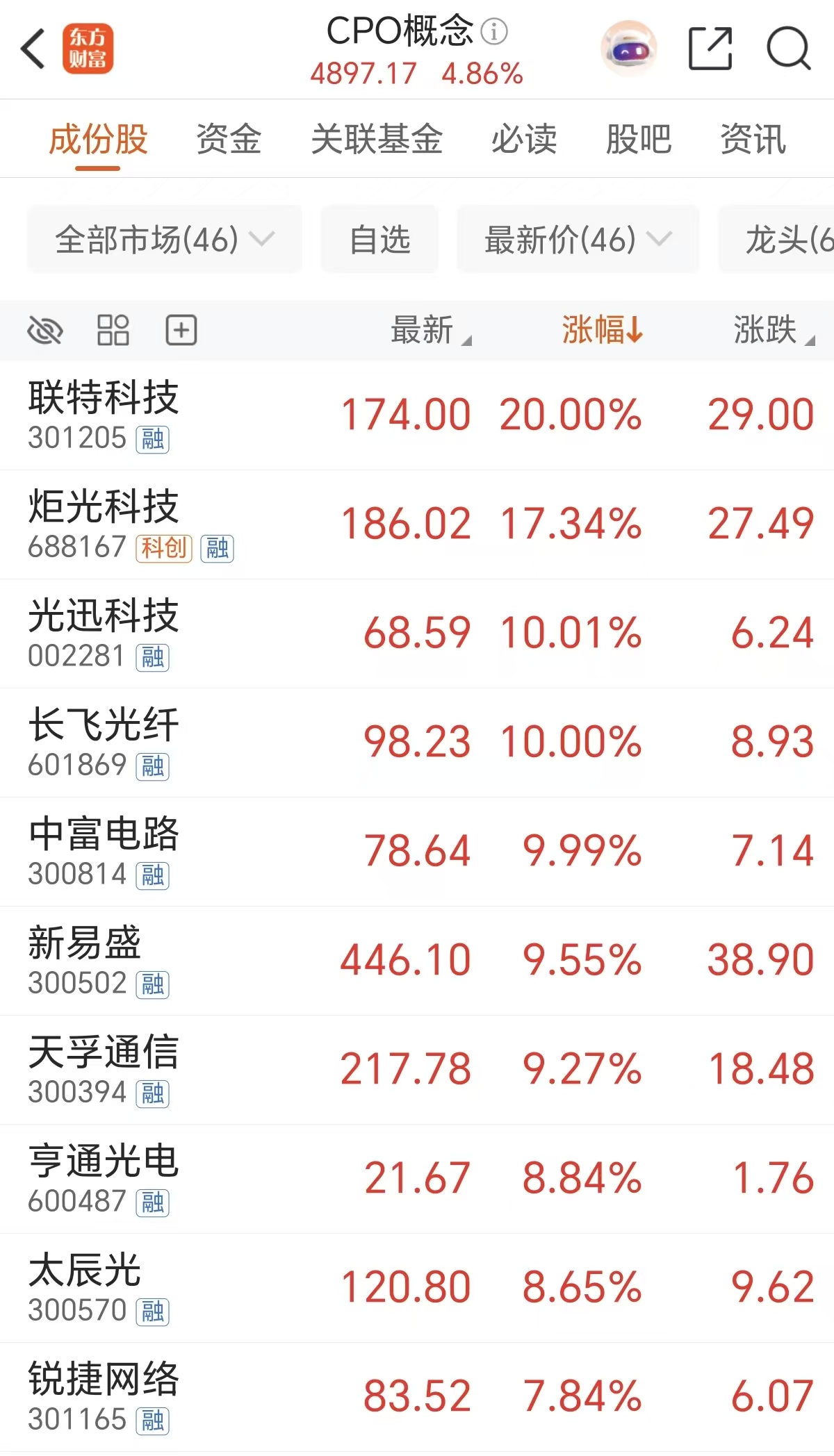 周三CPO概念再起,联特科技20CM涨停,炬光科技涨超17%,光迅科技、长飞光纤等多股涨停,龙头股新易盛、天孚通信等涨超9%。