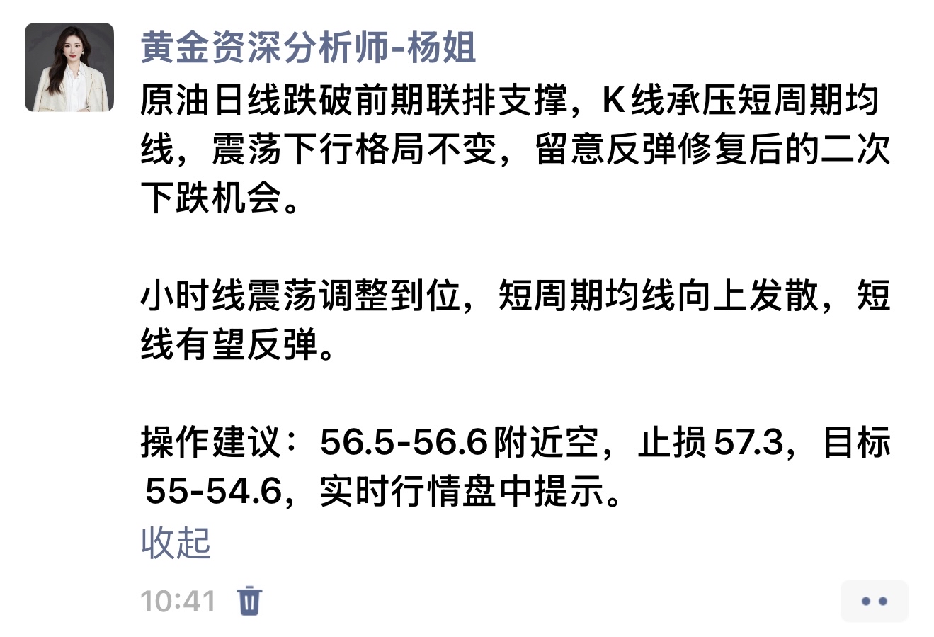 精准布局原油56.5一线空单,现价55.7已斩获80点!