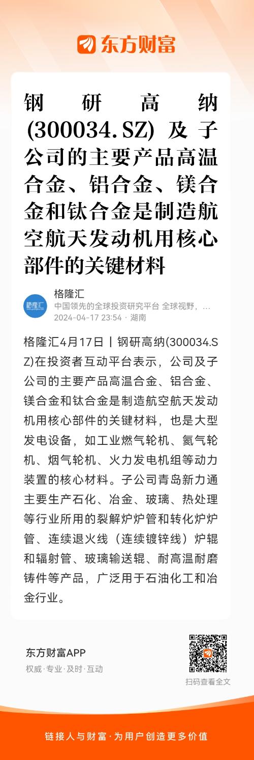 格隆汇4月17日丨钢研高纳(300034.SZ)在投资者互动平台表示,公司及子公司的主要产品高温合金、铝合金、镁合金和钛合金是制造航空航天发动机用核心部件的关键材料,也是大型发电设备,如工业燃气轮机、氦气轮机、烟气轮机、火力发电机组等动力装置的核心材料。子公司青岛新力通主要生产石化、冶金、玻璃、热处理等行业所用的裂解炉炉管和转化炉炉管、连续退火线(连续镀锌线)炉辊和辐射管、玻璃输送辊、耐高温耐磨铸件等产品,广泛用于石油化工和冶金行业。