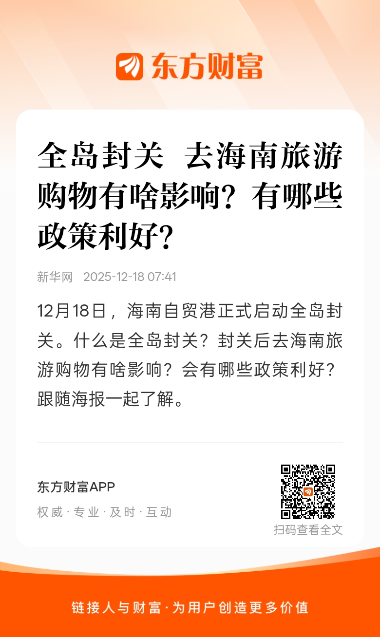 封关运作意义重大,它绝非封岛,而是为了更高水平的开放与发展。今天(2025年12月18日)海南自贸港正式启动全岛封关,封关后海南与国际的联系会更加顺畅自由,与内地的往来也更便捷高效。这有利于加快吸引全球优质要素集聚,推动海南自贸港高质量发展,更为全国改革开放探路开路。